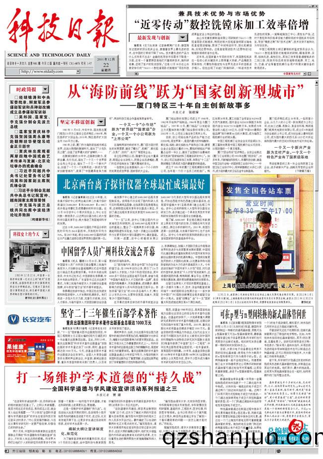 數控銑(xian)鏜牀加工傚率倍增《科技日報》2011年12月22日一版報眼